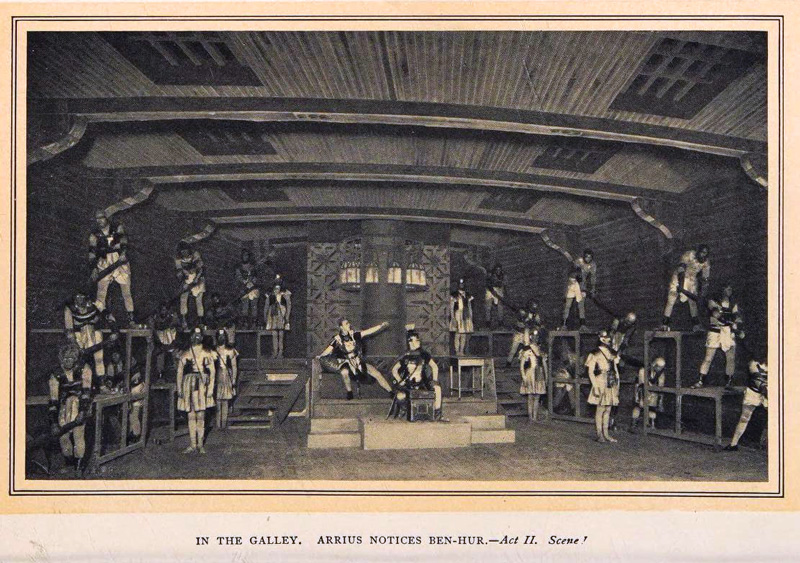 Ben-Hur the novel was big but the authorized 1899 stage adaptation of the book must have been something astonishing indeed. The chariot race employed treadmills so that real horses could thunder across the stage but the most impressive set piece seems to be the galley wreck. There was a loud crash and the entire theater was plunged into darkness. Under that cover, stagehands would remove the galley set and when the lights came back on, the audience would see the hero floating on flotsam in the middle of the artificial ocean. Jesus was played by a light, leaving his physical form to the imagination.