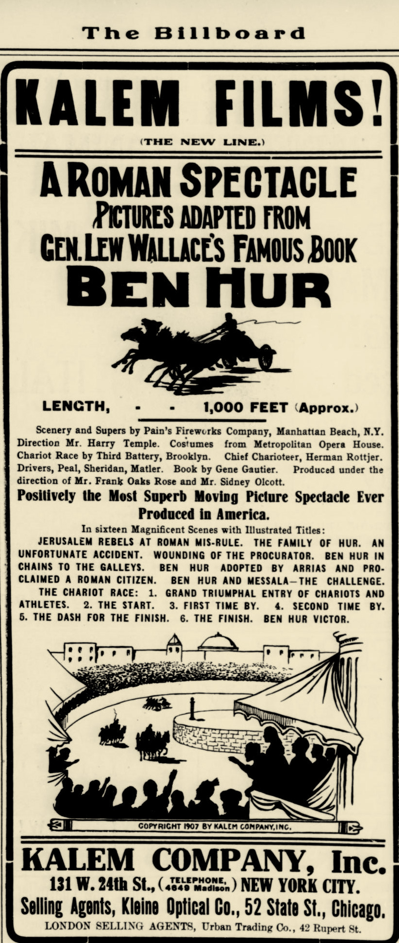 This was very true. One of the reasons why the 1925 version was seen as such a folly and a gamble was that Metro forked out the entire budget of a mega-epic to obtain the rights alone before a single set was built or frame of film was shot. Moving Picture World mused that the rumored 1907 version might simply be a retitled Passion play but Kalem ads for Ben-Hur soon put the matter to rest.