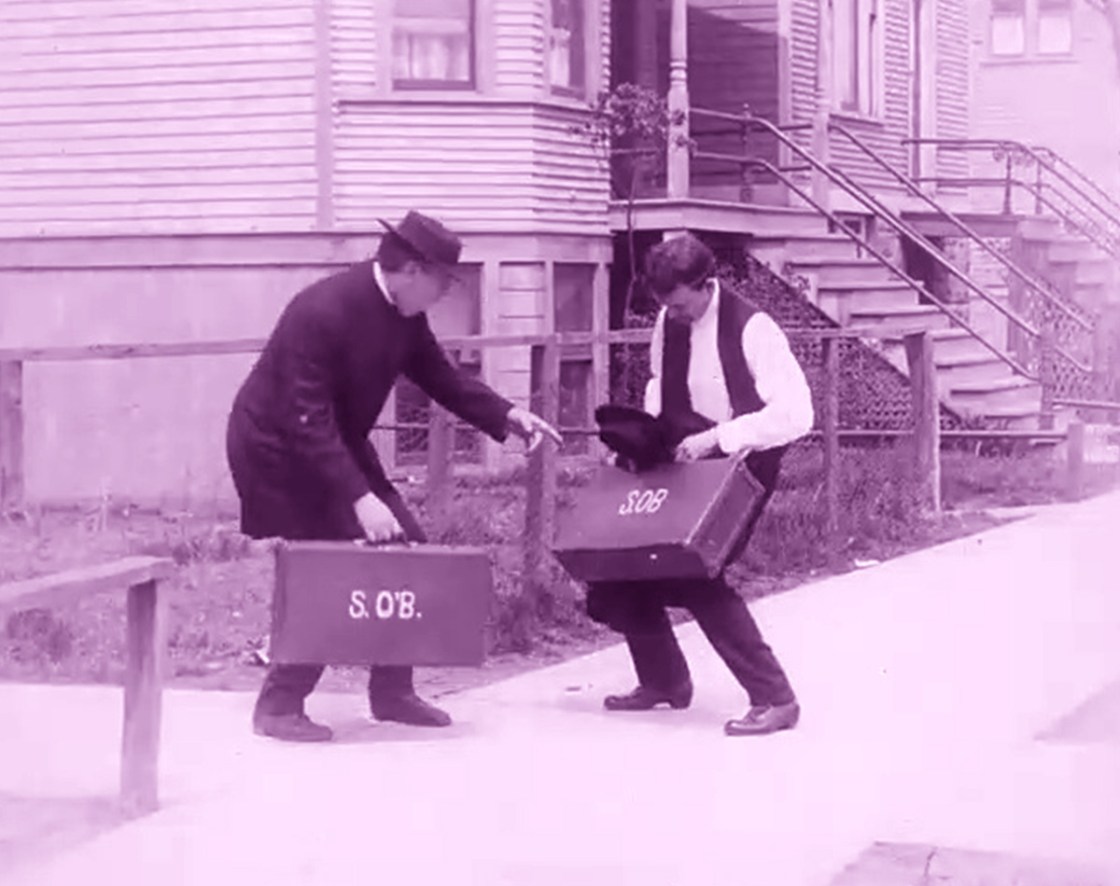 So, we have someone from 1908 discussing an event of 1906 and using abbreviation S.O.B. (well, s—o—b—) in the modern context. We can safely conclude that the S.O.B. suitcases were likely to have been a naughty in-joke that working class viewers would have enjoyed but the genteeler uplift types, film censors, would possibly have missed. This mirrors the comedy’s theme of gentility clashing with earthy wildness rather nicely, I think.