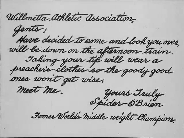 Meanwhile, the boys of the local athletic club are smuggling in prizefighter Spider O’Brien. At this point in history, boxing was outright banned in some locations and was at the very least viewed as a low and coarse activity by community leaders. So, the club has advised Spider to disguise himself as a clergymen when he arrives in town by train.