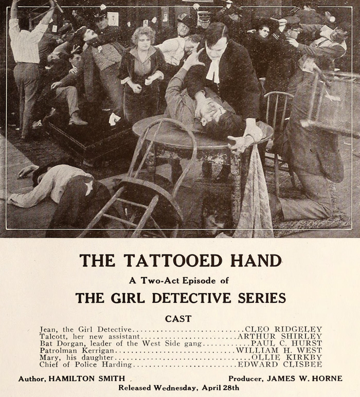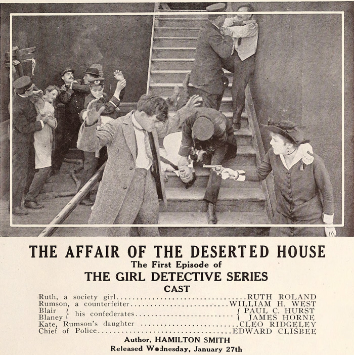 The Girl Detective would have been very much considered a step in a film career, not a career in itself. And so, Roland made seven pictures in the series before joining the ranks of Pathé’s serial queens and she was replaced by Cleo Ridgely, who played “Jean, the Girl Detective” six times. Ridgely landed a job at the Paramount lot and Marin Sais stepped into the series as “Bertha, the Girl Detective” for three episodes. Likewise, Robert Henry Grey departed halfway through Ridgely’s run and his Harry Warrington was replaced by Arthur Shirley as “John Talcott, her new assistant.”