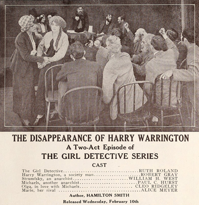 Most of the series entries are unaccounted for but, fortunately, Kalem published detailed synopses to market the pictures and they are pretty accurate when compared to the entries I have seen. The series kicked off in January of 1915, with The Affair of the Deserted House, introducing Ruth Roland as a debutante who has taken to solving mysteries in order to amuse herself. The police are so impressed by her skills that they hire her at the end of the short. The third entry, The Disappearance of Harry Warrington, features Ruth rescuing a well-heeled kidnapping victim, a naïve would-be socialist whose attempts to help the poor lead to him being abducted by anarchists.
