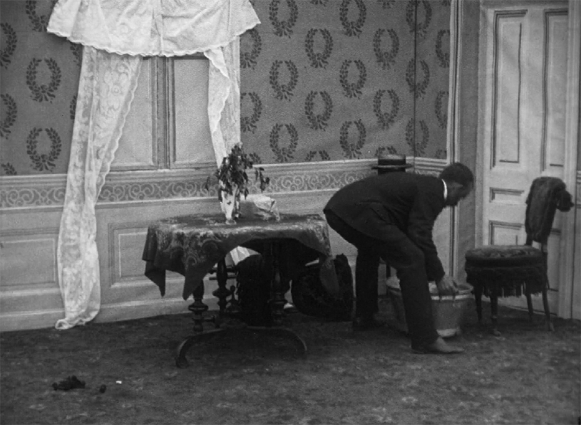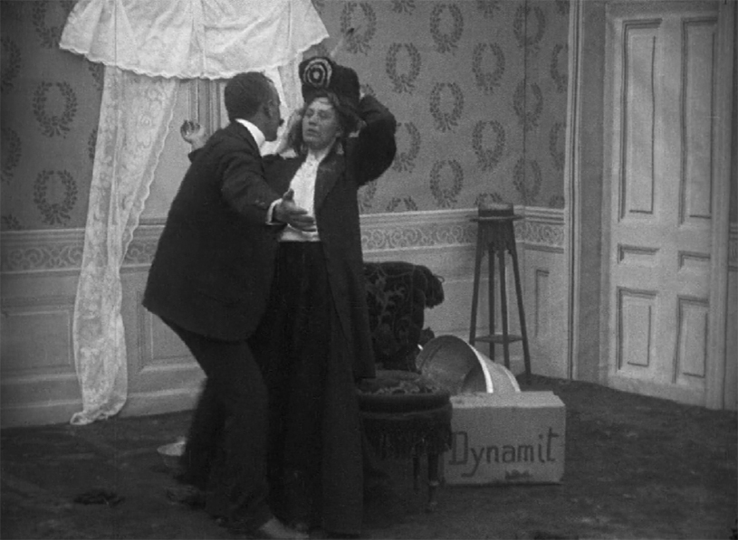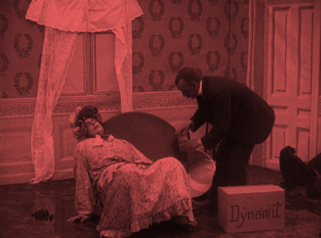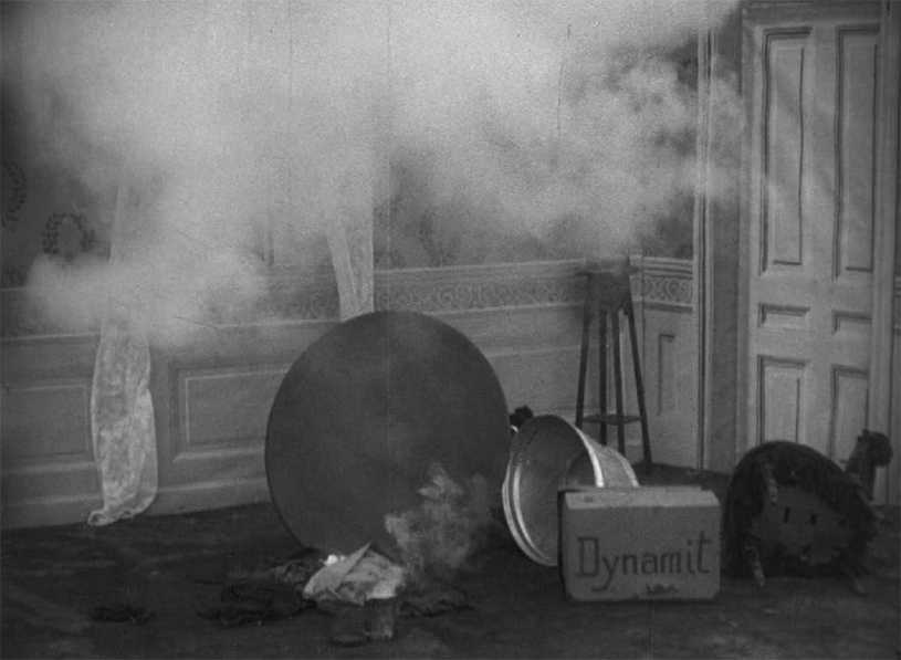 And at this point, most viewers would be likely wondering where the anarchist bit of the story comes into play. So far, we’ve just had a bit of domestic slapstick. Well, here it comes. The husband sets up a trap with a chair and a tub of water. When his mother-in-law trips and collapses, he rushes into the next room and returns with a box of dynamite. One lit fuse later, all that is left of the mother-in-law is a tattered dress. The main obstacle to their happiness out of the way, husband and wife embrace.