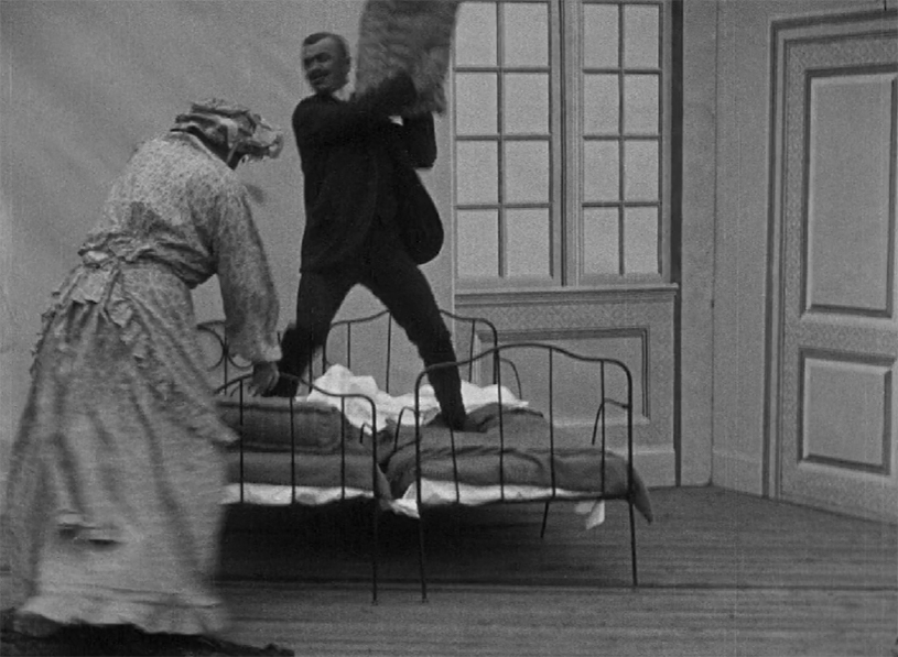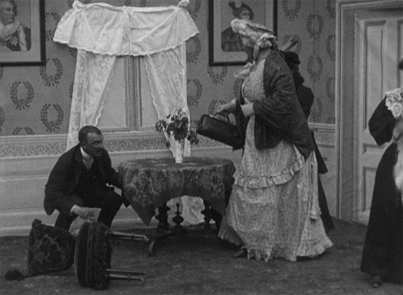 As was often the case at the time, the formidable mother of the anarchist’s bride was played by a hulking man in drag. A chase ensues through the apartment building with our diminutive lothario trying desperately to escape and finally falling out of an upper floor window. He recovers and rushes back in but this cannot go on, he needs a real escape…