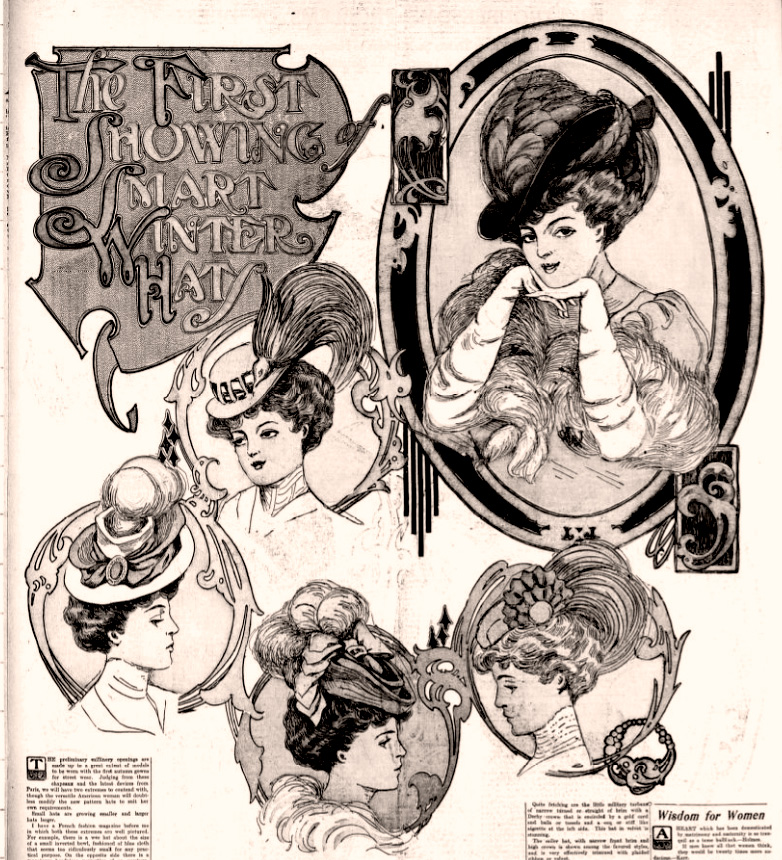 Oh, and we all know about the big hats but what about those hobble skirts? Well, as of this writing, Wikipedia (in its infinite wisdom) gives first placement to a ridiculous tale of a woman tying her skirt with a belt when she inaugurated women flying in 1908. But last I checked, 1908 is later than 1906, when A New Hat for the Madam was made, and hobble skirts were already clearly ubiquitous fashion back then. (Why do trivia books and Wikipedia always go in for these lazy “Eureka!” discoveries? I guess it’s easier than discussing the actual evolution of fashion.