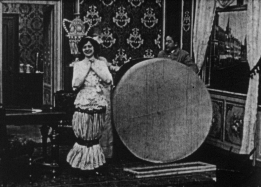 The film opens with Madam choosing her new hat. At the turn of the century, gigantic hats covered in all manner of flowers, feathers and veils were the rage and Madam means to outdo everyone with one at least four feet in diameter. Her husband (let’s call him “Herr”) supports his wife’s fashionable endeavors and even takes part the window so they can winch up the wagon wheel-sized hatbox. So what if her hat knocks down a vase or two in the living room?