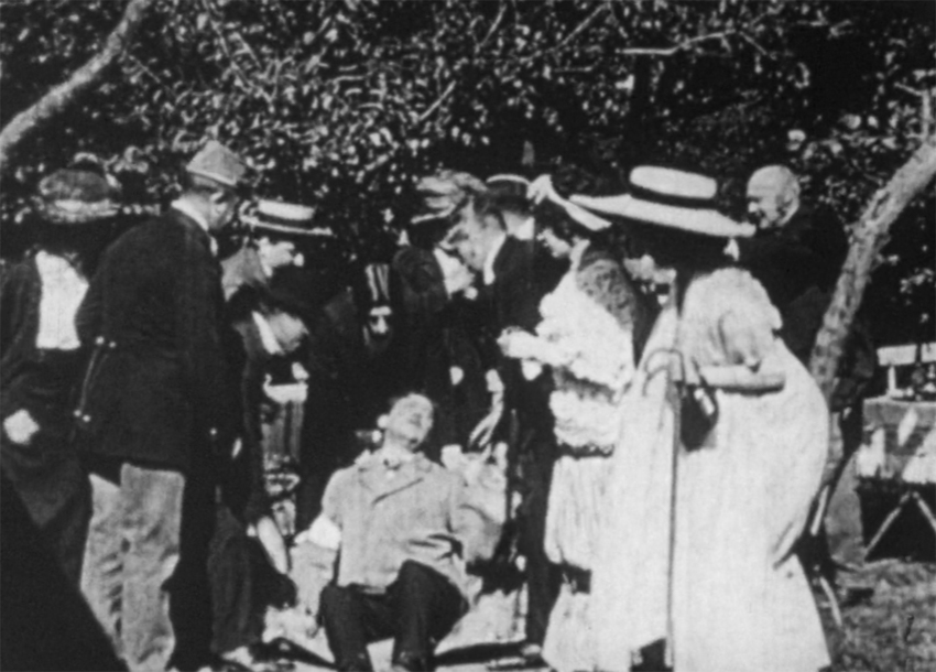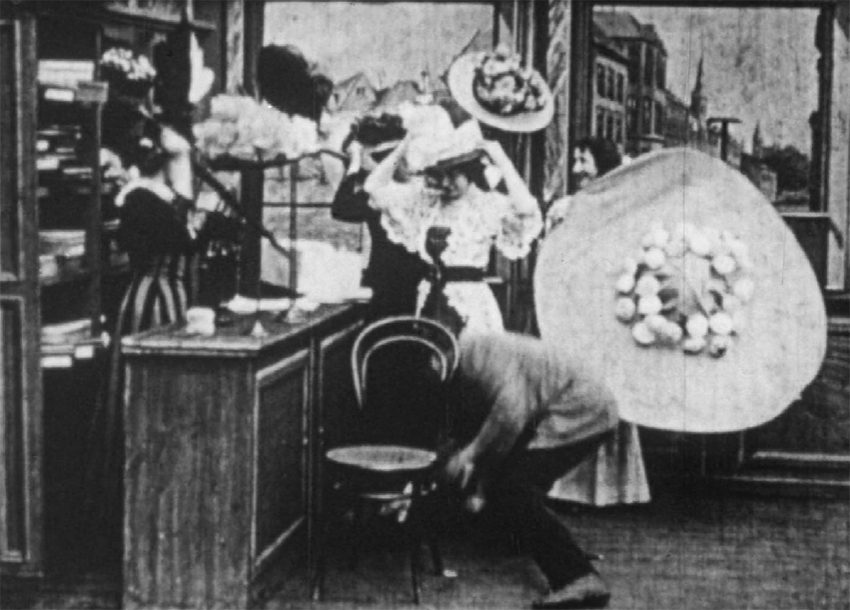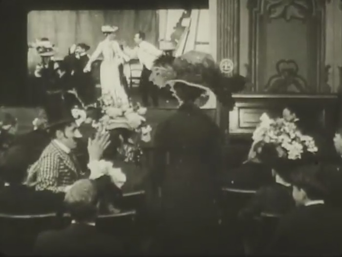 Now, the most obvious comparison is going to be Those Awful Hats, D.W. Griffith’s 1909 film mocking the big-hatted fashions and ending with some remarkably janky special effects portraying the inconsiderate women having their chapeaus dragged out by crane and one woman being carried away entirely by it.