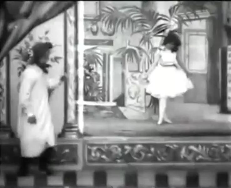 The countryman is amused by the first film, a dancer, and skips along with her performance. But then there is footage of a train chugging along the tracks toward him! The countryman flees in terror but returns to see a country romance playing out on the screen. The film cuts off here.
