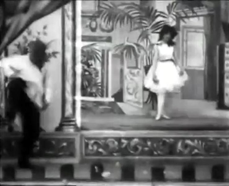 Unfortunately, we have only a partial print of The Countryman and the Cinematograph but we can get some idea of what the ending was like from the Edison… well, let’s be generous and call it a remake. Uncle Josh at the Moving Picture Show was released in 1902 and follows an identical sequence of events: a dancing girl, panic at a train and then a scene of country romance. Uncle Josh becomes so angry at seeing a country girl romance another man, he tears down the screen and attacks the projectionist. R.W. Paul’s film catalog described a similar final scene in his film.