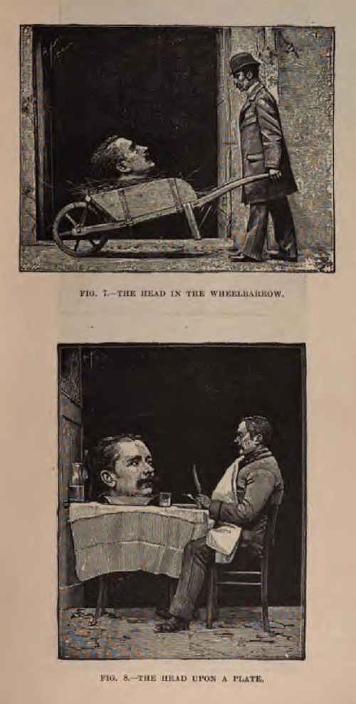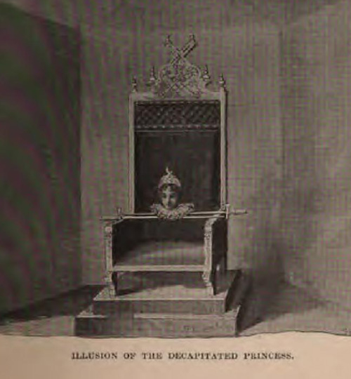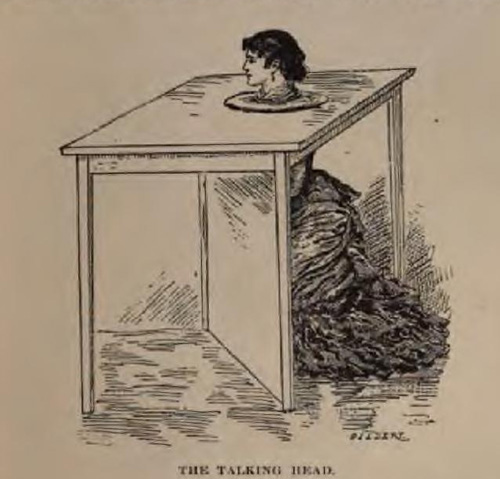 All of the talking head tricks were accomplished by having an assistant wear a collar to clearly show the division between neck and body. After that, some arrangement of costumes, lighting, cabinets and mirrors were used to make the assistant’s body disappear, the simplest being a table with a mirror underneath, angled so that it did not reflect the audience.