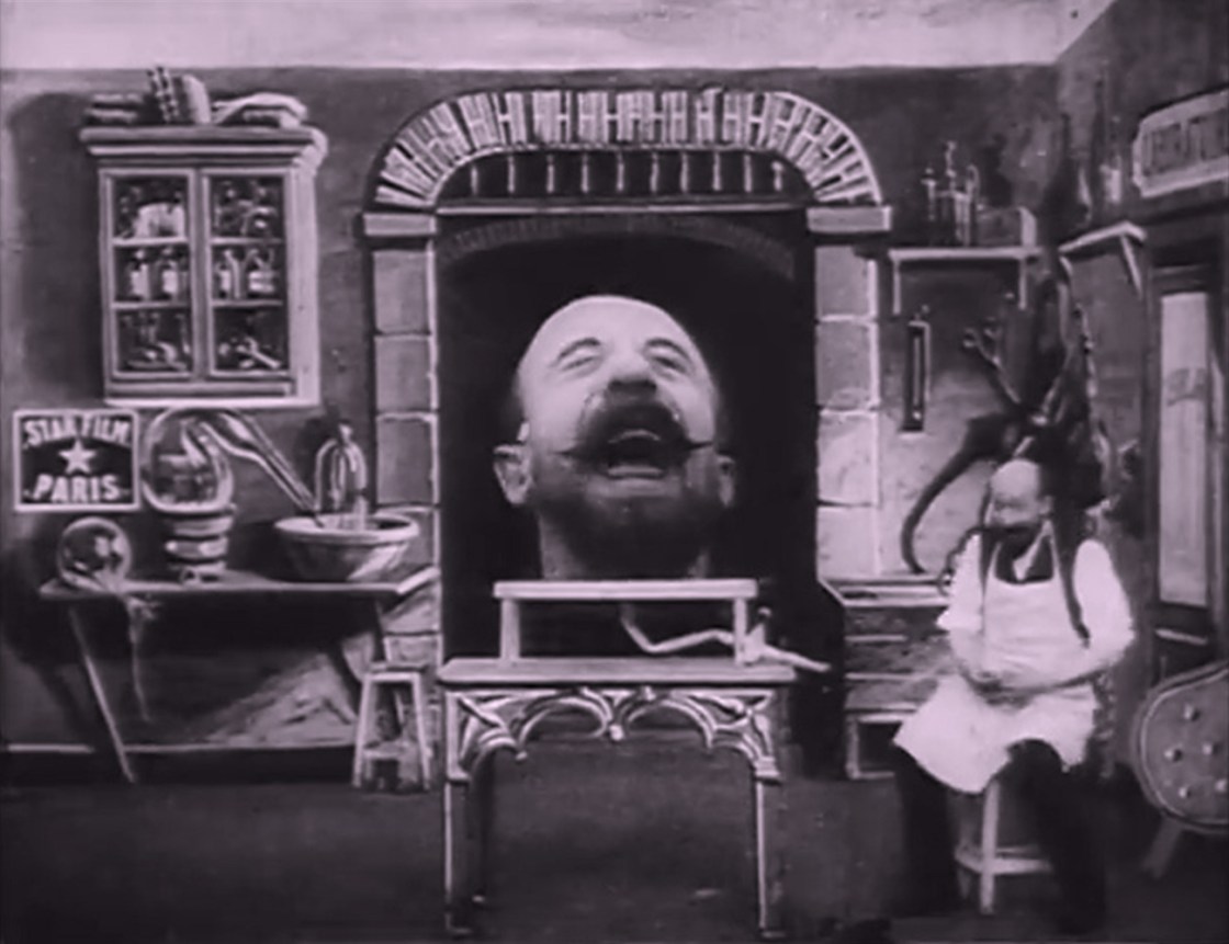 As always with Méliès, it’s important to examine the world of stage magic in order to appreciate what he brought to the screen. Decapitation and talking head tricks were wildly popular and there were many variations. Actual decapitations were reenacted using trick cabinets—though these were seen as an old hat by the 1890s. A more spiritualistic variation involved the decapitated head of an Egyptian princess coming to life and telling her tale of woe. A lighter version featured a head of a young lady floating above the stage before blowing out a candle and disappearing.