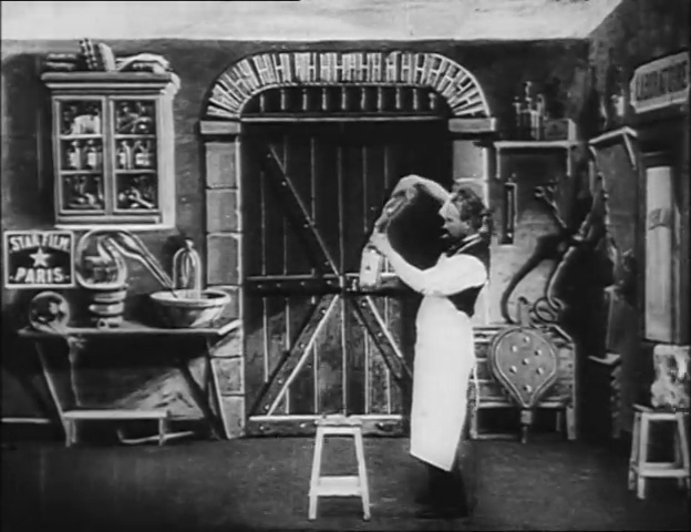 Méliès employed this collar trick, though he simply needed a black background and didn’t need to worry about mirrors. The real accomplishment was the smooth double exposure and the precise synchronization that he achieved in this one-shot film. He clearly employed very precise timing to make sure that the head’s growing and shrinking, as well as its reactions, matched what was going on in the laboratory.