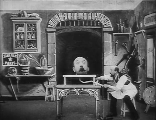 The head is delighted by its new stature but then the chemist lets out the air and it returns to normal. Things take a tragic turn when the chemist’s assistant has a try at the bellows. Despite the alarmed chemist’s pleas, he inflates the head too quickly and it explodes in a puff of smoke. The chemist swift defenestrates his assistant and then weeps over the fate of the head.