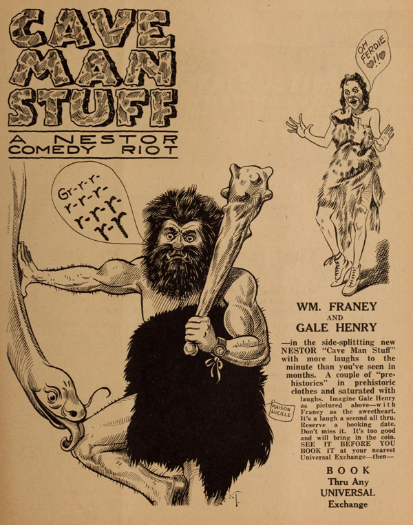 The genre was ripe for spoofing and Charlie Chaplin obliged with His Prehistoric Past (1914). I am not sure if the Gale Henry comedy Cave Man Stuff (1918) included literal or just metaphorical cavemen but the ad certainly makes it look like a scream.