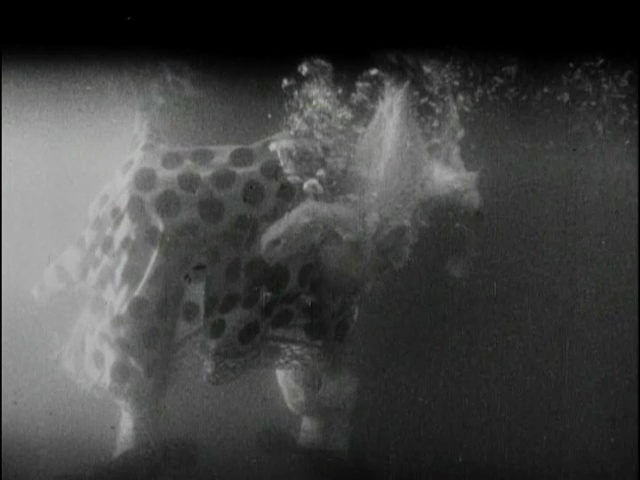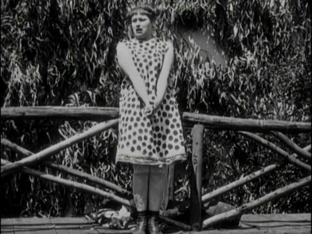 Later, the brokenhearted Ethel Teare decides to end it all by throwing herself off a bridge. The water is only rib-deep, of course, but a duck swims along and steals her shift, leaving her in her birthday suit and forced to slip home wearing a barrel. She conceals herself behind a sheet on the clothesline just as the barrel splits and then has to scurry to keep up with the sheet as her mother unwittingly pulls it away from her.