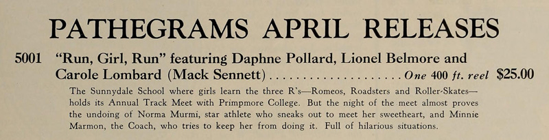 And this is where Run, Girl, Run enters the picture. It starred the diminutive Daphne Pollard, who was quite a wonderful comedian if she had the material to support her talents. (I quite enjoyed her work opposite Harry Langdon in His First Flame and her later parts in Laurel and Hardy films.) And, of course, the Sennett Girls and most particularly Carole Lombard. (I have previously covered this genre and collaboration in my review of The Campus Vamp.)