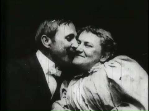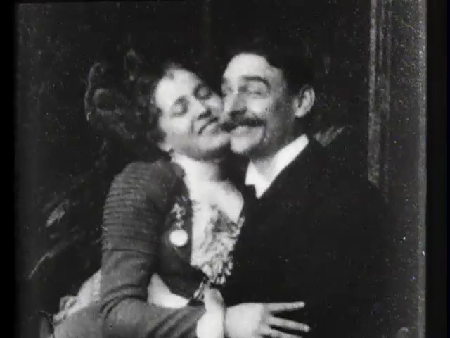 With early cinema, it can be difficult to pinpoint firsts because of the sheer scale of lost movies, not to mention the pile of counterfeits. However, even if it was not the first onscreen kiss, May Irwin’s 1896 film The Kiss was certainly the most famous and remains so. The film was a scene from Irwin’s play, The Widow Jones, and was meant to portray a comical romance. It was met with near-universal acclaim and daily screenings as audiences laughed with delight at the humorous, mustache-stroking smooch. While many texts claim that the picture was censored for sexiness, there is no evidence that this was the case and in The Emergence of Cinema, Charles Musser points to 1897 as the year organized film censorship kicked off with saucy movie peepshows as the initial targets.