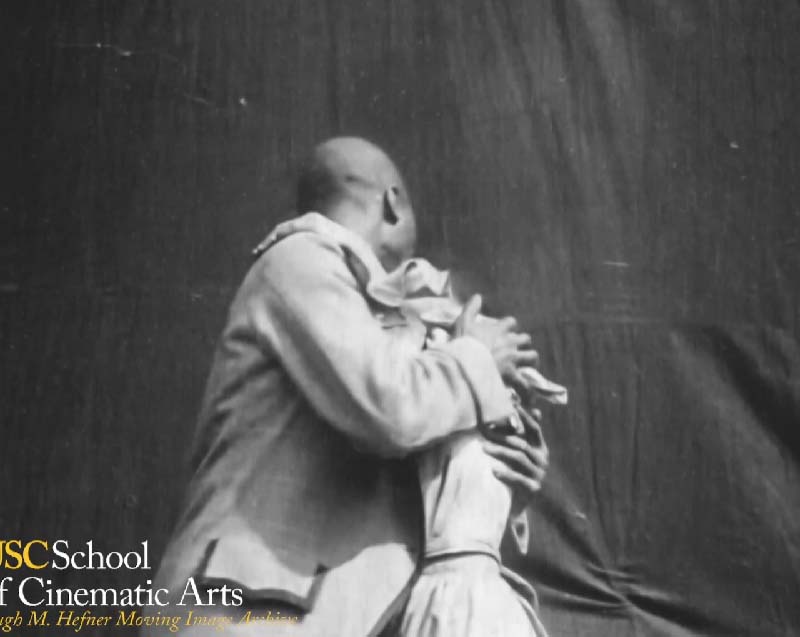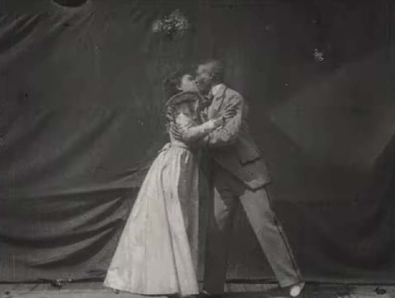 Further, while the surviving material of the USC version portrays just the kiss with little preamble, the Norwegian version shows us a more conventional love scene of the 1890s: Brown playfully rejects Suttle, he continues to plead his case on bended knee, they kiss jubilantly and then he gives her a twirl. It lacks the intimacy of the USC film, though it is still extremely appealing and the charisma of the leads comes through clearly. The decision to bring the camera a bit closer to Brown and Suttle, which seems to have been the standard for kissing films in general, made all the difference in the world.