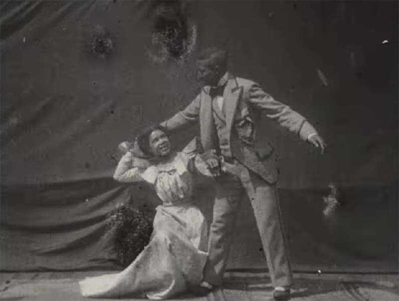 A pair of performers dressed to dance instead romance one another and share enthusiastic kisses. One of the more exciting discoveries of recent years, the two versions of this picture showcase the earliest known kiss between Black actors.
