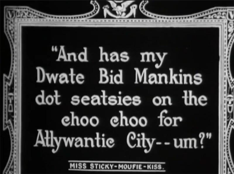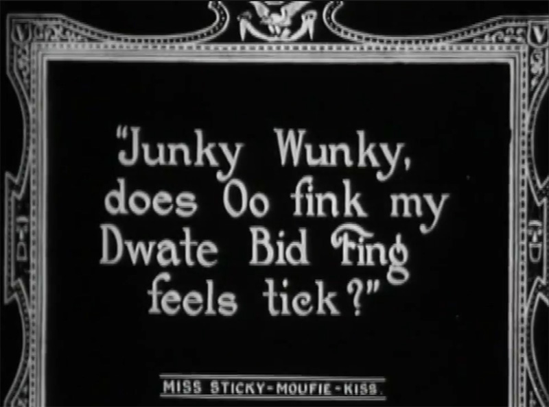 In addition, the title cards were slightly reworked so that the baby talk dialogue flows better and is decipherable immediately, rather than requiring a pause. Forcing the audience to pause and interpret was a cardinal sin with silent era intertitles. Jokes needed to be punchy, witty and fast.