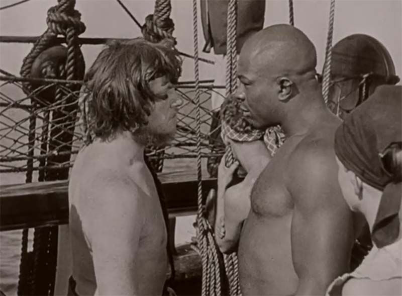 And so, the pattern for the next reel of the film is established: scenes involving the Constitution and its crew doing wooden ships and iron men stuff, scenes of Farrell and Ralston being tortured and giving one another passionate looks. It drags. Yes, indeed, does it drag.