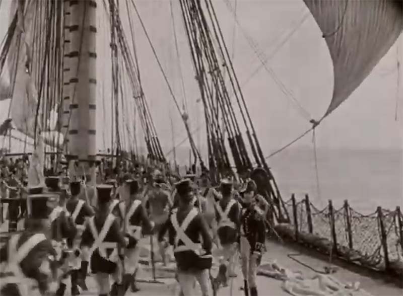 The Constitution stuff is terrific, though. The destruction of the Philadelphia scene is lean and efficient with Decatur leading a lightning raid, his men blowing a hole in the bottom of the ship and then they all sail away calmly as it burns in the background. (We are all familiar with the “walk slowly and calmly away from fiery destruction” trope and this is an early nautical variation.)