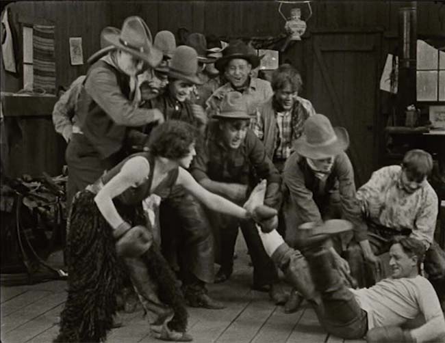 That being said, Rowdy Ann lives up to its title and then some. Tincher, a comedian noted for her tomboy roles, plays the title character, the daughter and heiress of a wealthy rancher. She rides out with the stock alongside the cowpunchers but then one of them, Handsome Hank (Al Haynes), gets fresh and she rejects him. The foreman (Harry Depp) decides to defend her honor by challenging Hank to a boxing match.
