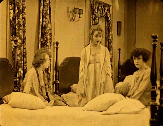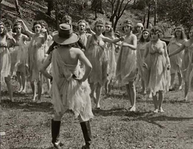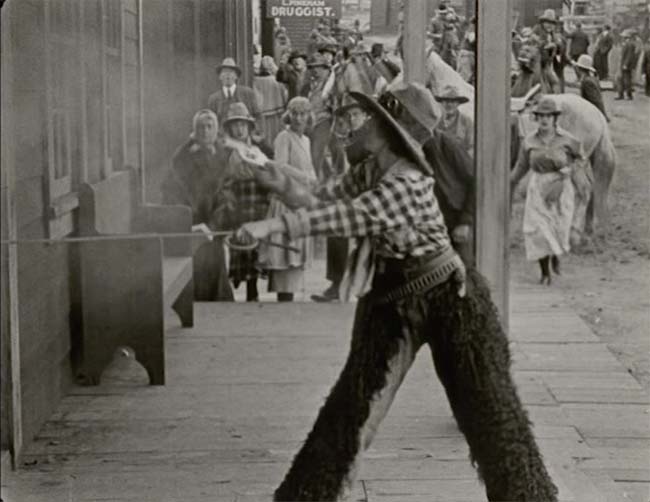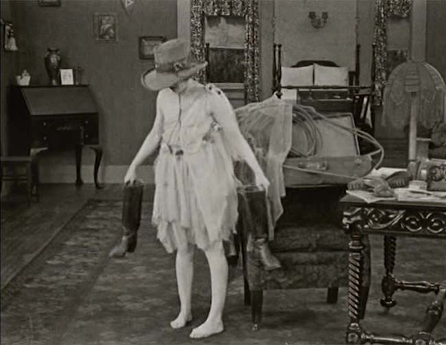 Another interesting thing to watch in this picture is that, while most western comedy wild women would focus their talents on the men in their lives (note especially The Paleface and its remake, The Shakiest Gun in the West), Tincher helps her suitor at the beginning but then focuses her western skills on helping fellow train passengers and her college roommate. The picture closes with the women embracing, no male suitor in sight, and the heiress gets walloped with a pillow for her sins.