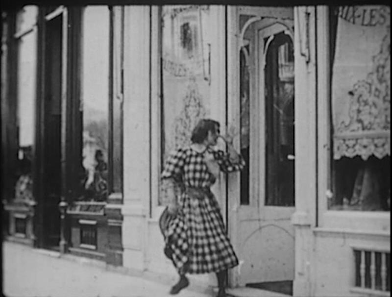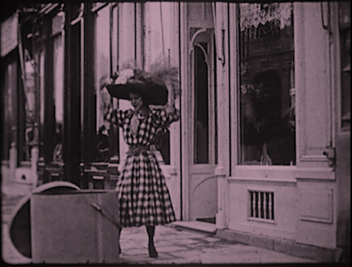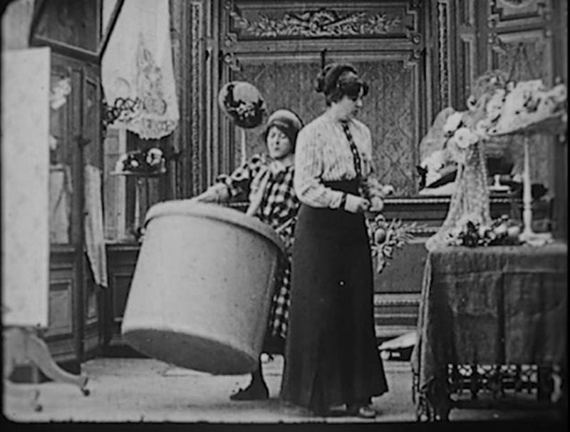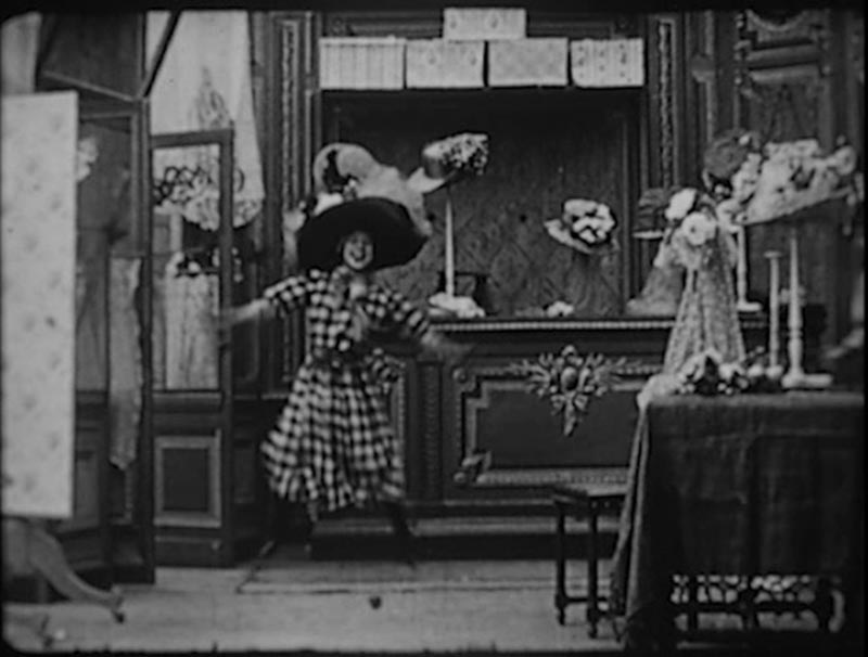 This brief picture starts with Léontine employed by a milliner. Her mission: deliver a large and extravagant hat to its new owner. Léontine quickly opens the box and appropriates the hat, tossing her own small, age-appropriate hat into the box in its place and boldly wearing it right into the customer’s house. She pulls faces at both maid and mistress and accepts a five-franc tip for delivering a tiny, used straw hat. When she is pursued for her theft, she uses a trapdoor to rid herself of her victims before having her grand hat reclaimed by her boss.