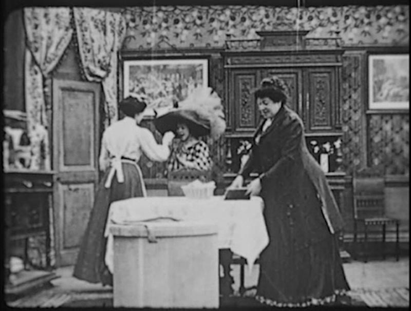 On the screen, D.W. Griffith used Those Awful Hats to turn oversized headgear into a moral cause and inflicted violent revenge via crane on the women who refused to buckle under and remove them in a movie theater. (All top hat-wearing men were spared.) Danish pioneer Viggo Larsen took a more subtle and interesting approach in A New Hat for the Madam, making large hats and hobble skirts a symbol of modern enslavement to social mores, and showing the wacky consequences wreaked on men and women alike.
