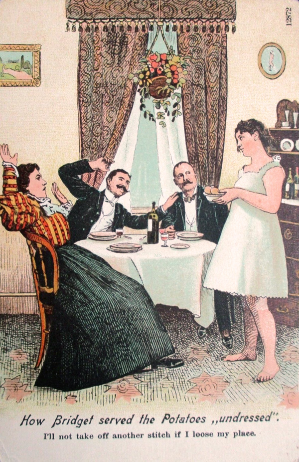 In this case, a couple is sitting down to dinner when the wife goes to remind the cook that the salad is to be served undressed. The Irish cook gestures “What will these crazy Americans want next?” and removes her clothing down to her corset and chemise. The wife is horrified and the husband amused when they receive, as requested, their salad to be served undressed.