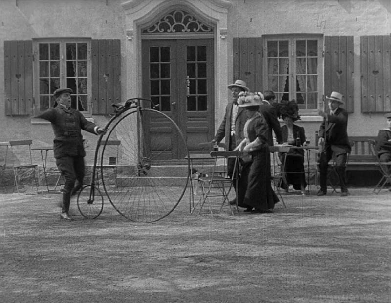 Early special effects extravaganzas are still beautiful and appealing to look at but the did sometimes verge into the claustrophobic. More elaborate effects sometimes needed the controlled environment of a studio setting but that did come at a cost. For The Witch and the Cyclist, Viggo Larsen shot entirely out of doors, making use of wooded roads to create an open and lyrical backdrop for his zany story. The pub setting is spacious and the mirth of the background characters hint that, perhaps, the local witch has performed this kind of mischief before.