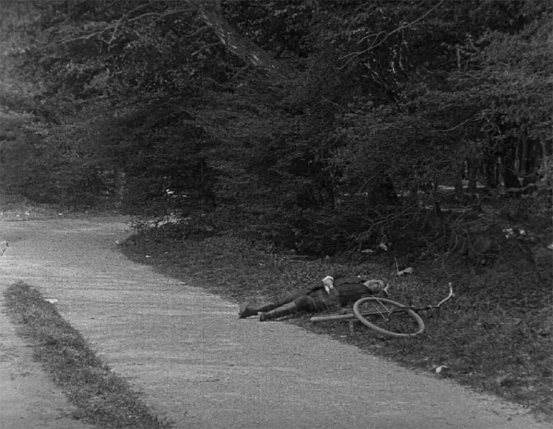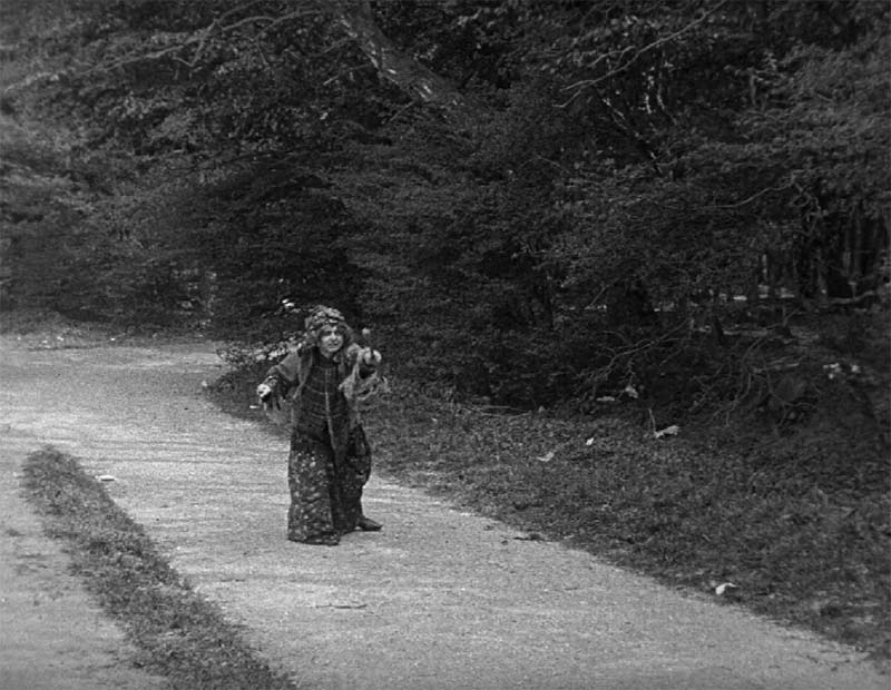The short film opens with a cyclist pausing on a country lane and taking a nap under some trees. As he sleeps, he dreams that he goes speeding by an old beggar woman, waving her aside. Well, you guessed it, the beggar is our witch and she forces the cyclist to ride backwards back to her. The cyclist gives her a piece of his mind but that proves to be a mistake. She transforms his clothes into rags, transports his bicycle up a tree, turns herself into a stylish cyclist and then rides off.