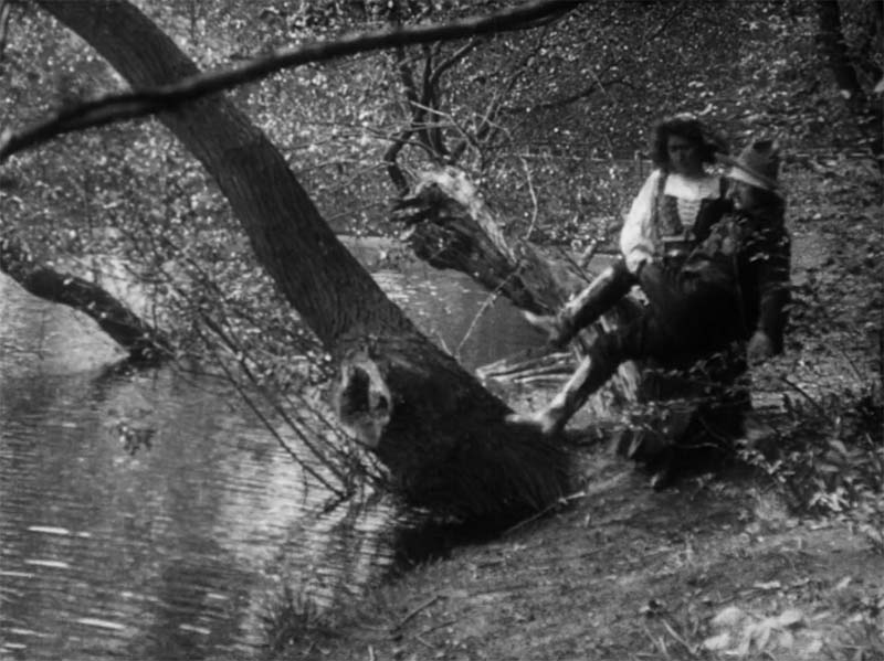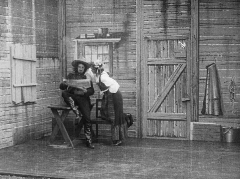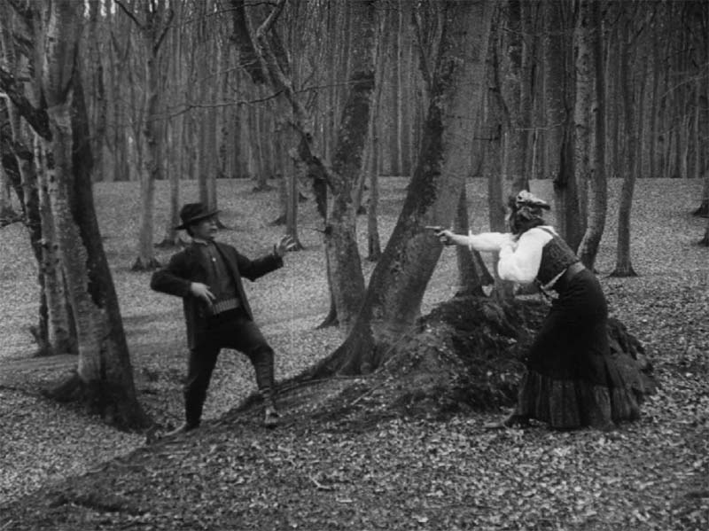 It is possible that Larsen simply bit off more than he could chew in the context of the breakneck production speed of the era. The Robber’s Sweetheart was a more elaborate picture than other Larsen films of the same era. I counted fourteen different scene locations jumping between painted sets, real structures and exterior forest shots. In contrast, The Other Woman had only four different exteriors, cutting between them as the drama commenced. Then again, A New Hat for the Madam (1906) had a whopping nine locations and it was still delightful.