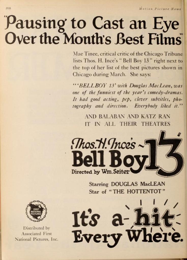 The review in Exhibitors Herald writes the film off as okay but with a forgettable plot. Motion Picture Magazine felt that Bellboy 13 was not a good vehicle for MacLean and simply was not as good as The Hottentot. (More on that picture in a moment.)