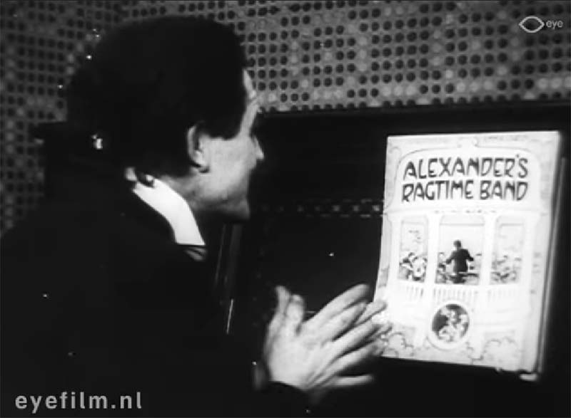 The film would have been accompanied by live music when it was initially released— larger theaters quickly learned that quality music was a draw and smaller houses had to at least offer something, even if it was just the church piano. In Oh, You Ragtime! the sheet music was carefully displayed onscreen, so the picture was practically screaming for the accompanist to follow the onscreen pianist’s lead and bang out some Irving Berlin.