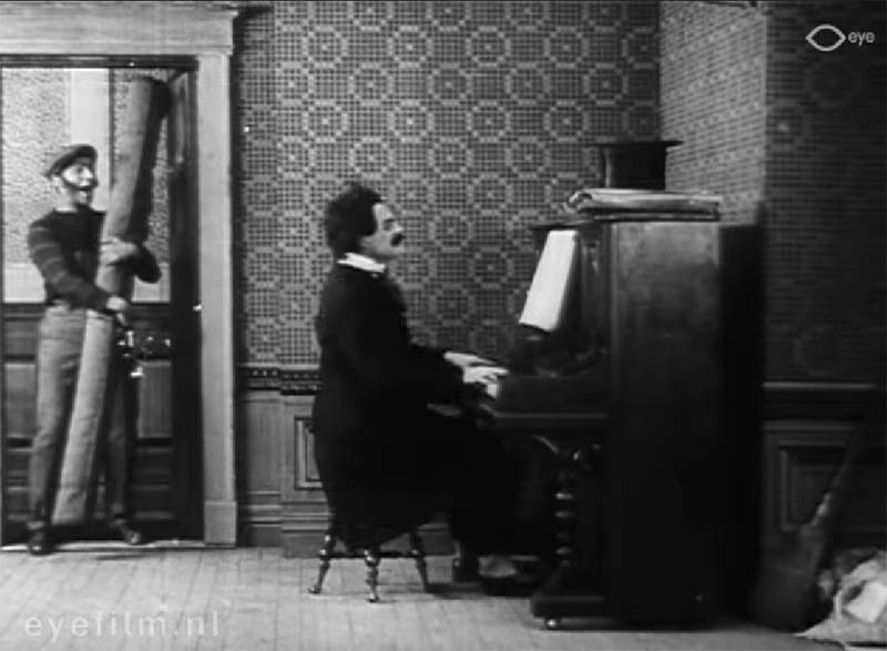 Oh, You Ragtime! was made by the American arm of the French Éclair company and its plot is simple but effective: A musician is moving into a new flat and is very fussy about the care and location of his beautiful piano. (The fact that the musician looks very much like someone who lives on a hill in Los Angeles and would later have an instrument delivered by Mr. Laurel and Mr. Hardy adds to the film’s charm retroactively.)