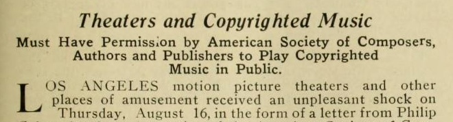 So, where did that leave the playing of pop music in movie theaters? Well, around the same time the Ben-Hur case was playing out, the music industry was exploring its legal options to deal with unauthorized use of copyrighted works, from player pianos to movie theater singalongs.