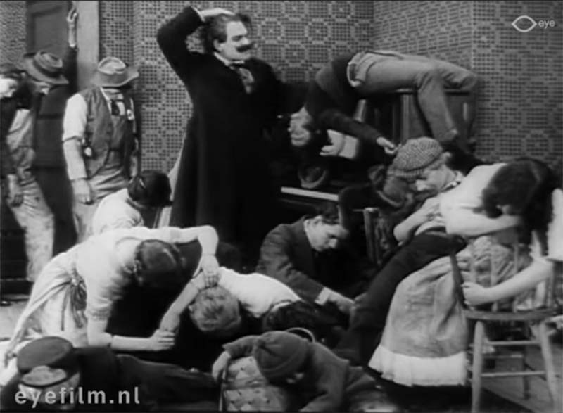 The musician finishes playing and is angry to see his apartment filled with sleeping strangers. The surviving footage ends here but Moving Picture World states that in the original ending, the musician switches to playing a quick-step and drives everyone back to work again. Apparently, special effects were used to portray the crowd returning to their duties and the scene is described as the highlight of the film. A pity the footage seems to be lost.