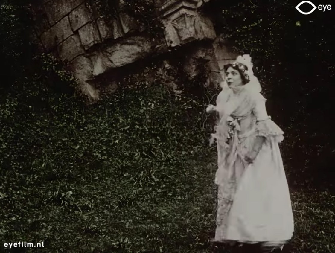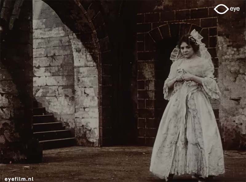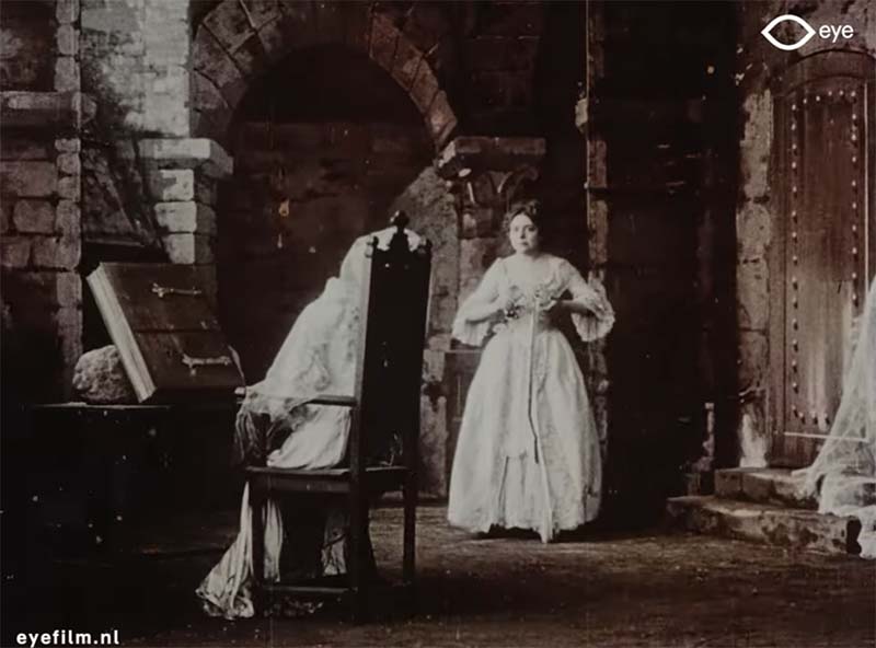 Capellini’s earlier productions featured the painted sets that were standard in French films of the era but his had a bit more depth and realism than the stage-inspired scenery of Méliès. It’s not surprising that, given a proper ruined castle to play with, Capellini would go to town, and include mood-building sequences of the heroine wandering through the ruins with her bridal veil lending an uncanny flavor to her appearance. Her glee begins to give way to terror as she enters the death chamber, a set but a pretty realistic one.