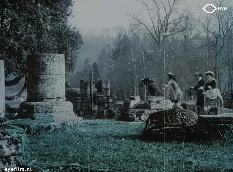 First of all, I have to say that this film is stunning. The sets and scenery (more on that in a minute) are perfectly complemented by the elaborate costumes and delicate stencil color. The color seems to have faded with time but I quite enjoyed the muted palette. The reds, infamously fugitive but very popular in applied color, likely were the first to go. Please note that the titles are tinted red and the color is still vibrant but these would have been prepared separately from the Pathé Frères stencil color process, was colored using a completely different chemical method and could have been made in Germany, where this particular print was released.