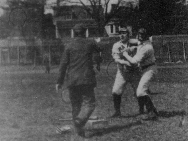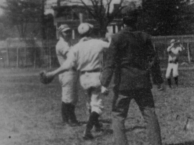 Casey at the Bat is shot from behind home plate by director James H. White and shows mighty Casey swinging at the ball but frustrated by the umpire’s calls. Finally, he has had enough and kicks the ump’s legs out from under him before attempting to throttle the man. Spectators jump into the fray and the film ends with the brawl still well underway.