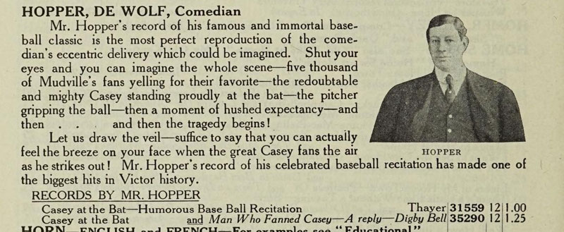 By this time, Hopper had been reciting the poem for over three decades but there was a rival Casey in the 1890s, recording superstar Russell Hunting. While Hopper approached Casey with great gravity and mock grandeur, Hunting adopted an Irish accent. (Casey, along with Kelly and Clancy, were go-to Irish names in fiction at the time.) Ethnic humor was wildly popular, with comedians affecting Irish, Dutch, and Yiddish accents, among others, as part of their regular schtick.