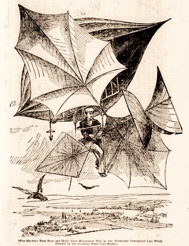 There is a big problem with this particular boast: while Zecca’s wonderful airship had no balloon, the machine Happy Hooligan was shown riding was not drawn from speculation and was likely based on a real invention in use at the time. Carl Myers had demonstrated his pedal-powered balloon (dubbed the Sky-Cycle, Aerial Bicycle and Air Velocipede) in 1895 and patented his invention in 1897, though it remained more of a novelty than a practical means of transportation.
