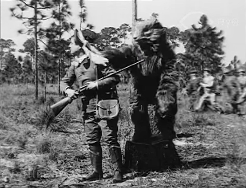 That may have been what the character of Willie had in mind. Willie the Hunter opens with our hero showing off his Roosevelt-esque hunting gear, complete with shotgun and shells. His friends at the club decide to have a bit of fun at his expense, so they distract him, empty the pellets from his shells and then rush out to the costume shop. The shop conveniently has a bear suit ready to go, one of the friends dresses up and…