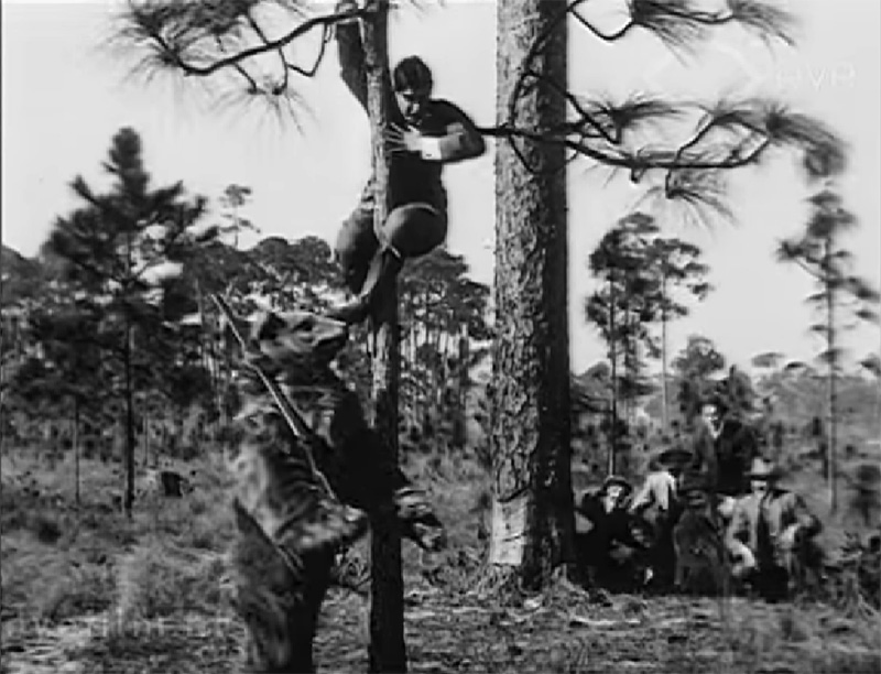 Willie is stalking his prey when he realizes that he himself is the hunted. The “bear” chases him up a tree, takes up his gun and stands guard and then forces Willie to beg for his life. Once he escapes from the bear, Willie decides to embroider the truth a bit and enters the club claiming that he had been involved in a violent brawl with a bear and emerged victorious, of course. Meanwhile, the friend in the bear suit sneaks up on Willie and causes him to faint dead away.
