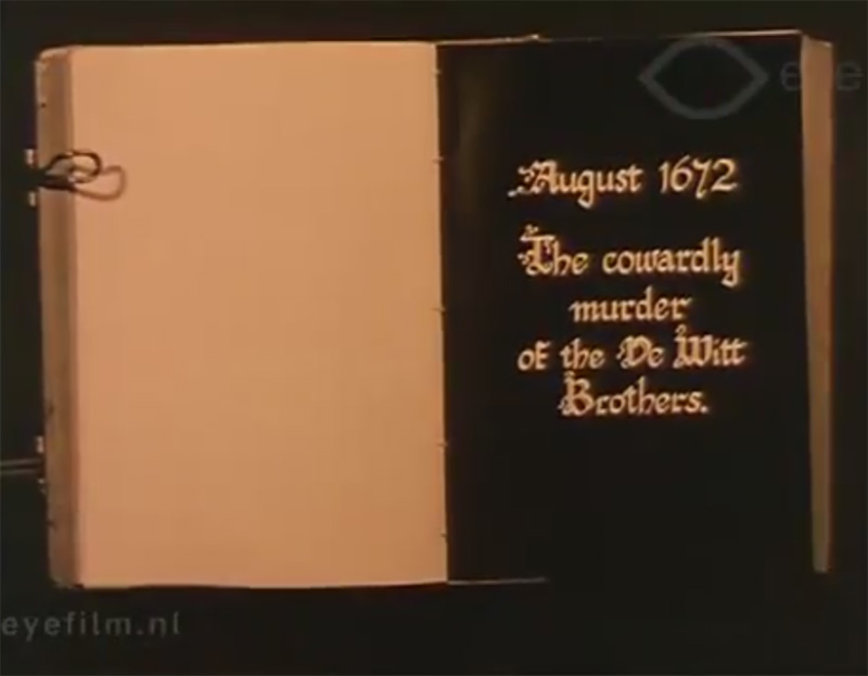 The mob gets slightly more animated at this point but I am still not buying that this is an enraged army of cannibals. I understand why the deaths of the brothers de Witt were not shown—this is a family film, sir!—but what follows is simply a sober proclamation that their deaths were a black page in history, followed by showing a black page in a book.