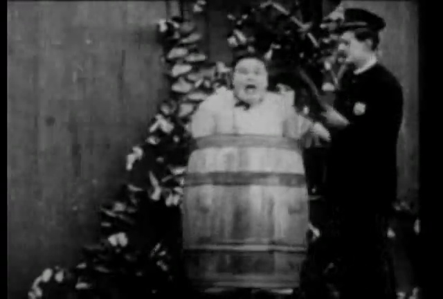 The dividing line between classic silent slapstick and cartoons has always been thin, as witnessed by Chase’s pistol-wielding antics through a crowded dance floor. People interested in the topic will enjoy the fact that Arbuckle is obliged to wear a barrel in order to cover his abbreviated attire, an animation staple.