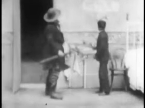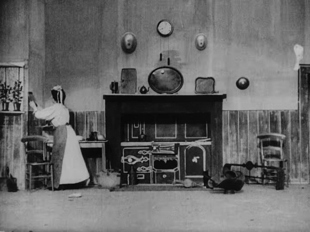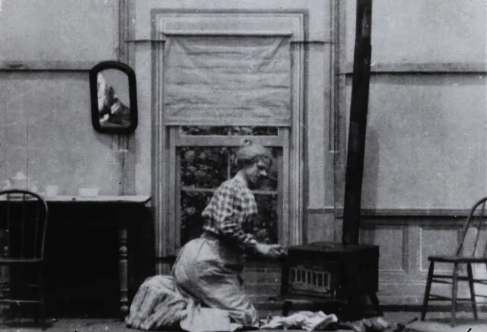 The next year, Edwin S. Porter of the Edison company tried his hand at the gag with The Finish of Bridget McKeen. This time, Bridget (almost certainly played by a male Edison employee in drag) is in classier surroundings with houseplants and tidy pots and pans hanging from the wall. However, her frustration is the same: that stove just will not light.