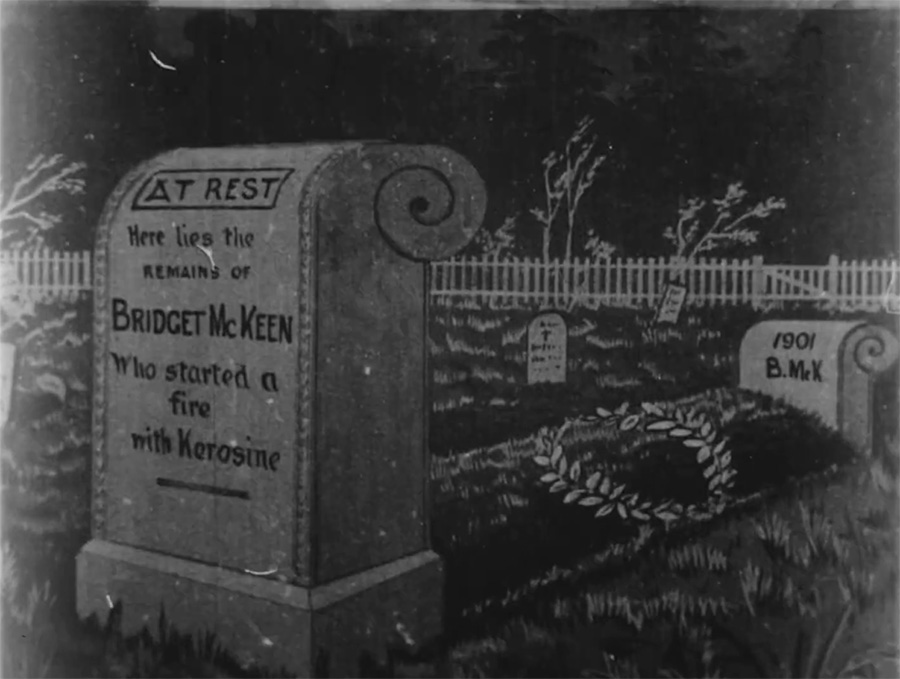 Porter didn’t stop with comic body parts and added a second scene to the film, a shot of an artistic title portraying Bridget’s tombstone with a 1901 year of death. “Here lies the remains of Bridget McKeen, who started a fire with kerosine.”